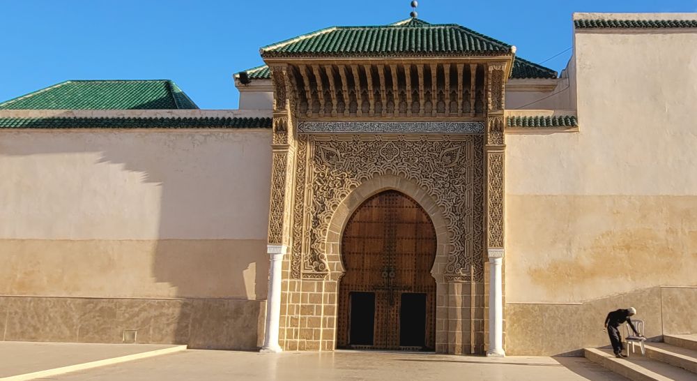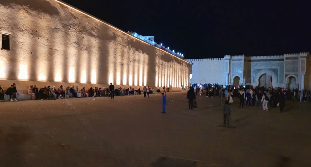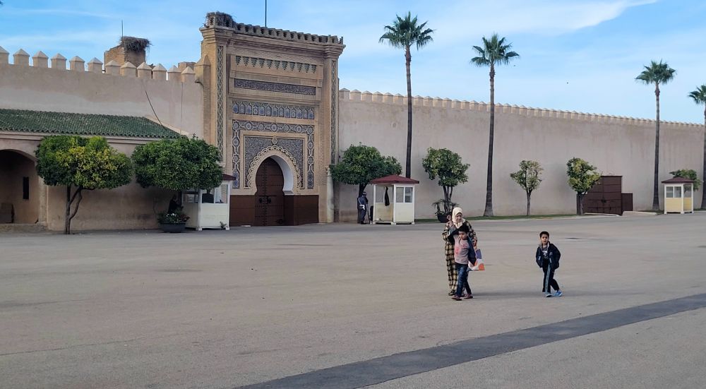 回到城里,下午先去了一墙之隔的皇宫外面打卡。虽然上午去的伊德里斯小镇是摩洛哥王朝的摇篮,但梅克內斯成为皇城却是几百年之后的17世纪。1666年摩洛哥当今的阿拉维王朝的祖先谢里夫拉希德趁上一个萨阿德王朝內乱之机发动叛乱,攻占菲斯并建立了阿拉维王朝。其弟穆莱伊斯梅尔继位后将都城迁往梅克內斯,并且执政长达55年,其间是摩洛哥王国最鼎盛的时期。