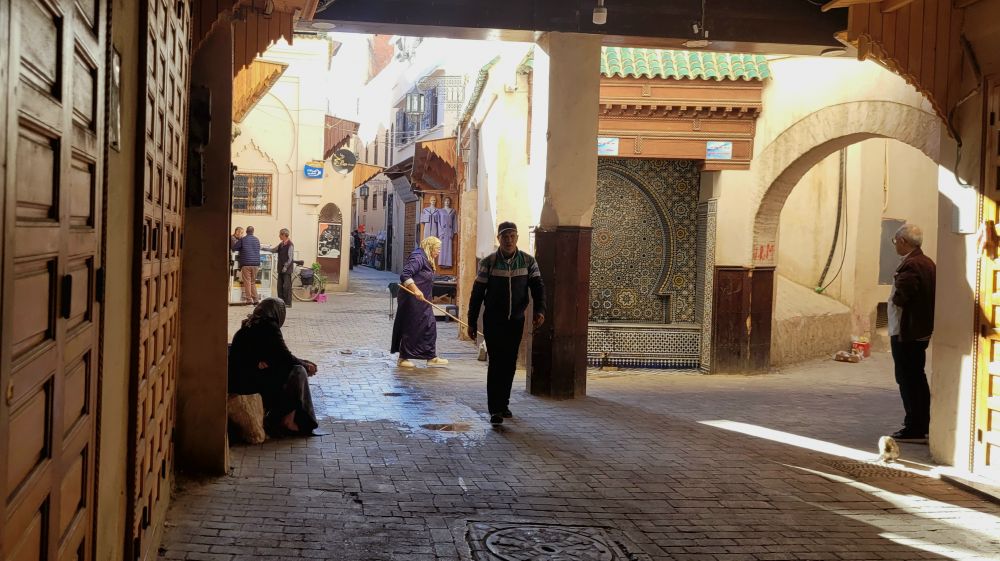 伊德里斯的停车场在小镇入口,我们要去的伊德里斯陵墓所在的清真寺在小镇中心。一路上不断有人提出要为我们带路去山上的观景点,但我们想先到了清真寺再说,婉言谢绝了他们的好意。镇中心是一个不小的广场,广场一边长长的拱廊有不少商铺,另一边高大的拱门则是清真寺的入门,不过遗憾的是,清真寺不对非穆斯林开放。