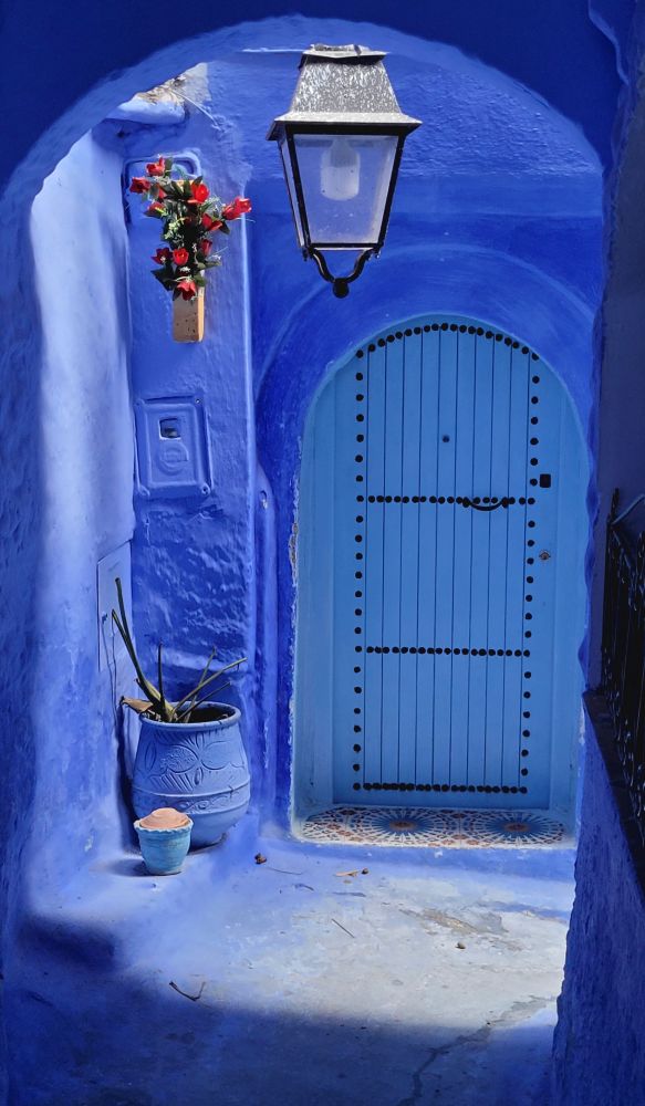 我们在古城中随心所欲,信马由缰,也不管有没有网红打卡点,只要见到小街小巷就拐进去。也许我们错过了打卡的景点,但因此也有自己的发现,更重要的是没压力游得轻松。我们觉得小城的一个看点,就是各家各户的门洞和门本身。有些有各种装饰,有的则只是简简单单一个蓝色的小门,或繁或简,都各有自己的美感。也是这些各种各样的蓝门,我不由联想到地中海东边希腊有名的海岛圣托里尼,那边既有蓝色的圆顶,也有各式各样的蓝门。