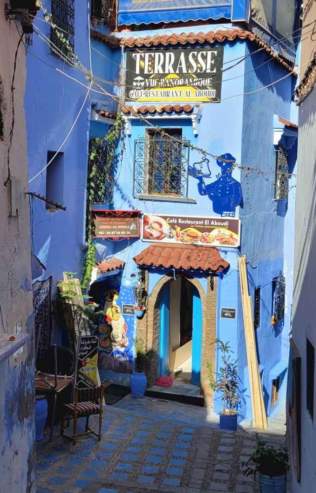 到了蓝色山城,当然要看那些蓝色的小街小巷了。老城不大,一条来路通到中心广场,中心广场其它几面则是小街小巷。我们先选择了中心广场对面一条小街,弯弯曲曲,一路都是下坡路但不陡。小街两边除了卖各种特色小商品的店铺,最引人注目的就是几家餐馆了。其门面不是有特色的装修,就是独特的画作,总之让人一眼看到后印像深刻而难忘。小街尽头是一道城门,不大,外面就是通到中心广场的那条主路。