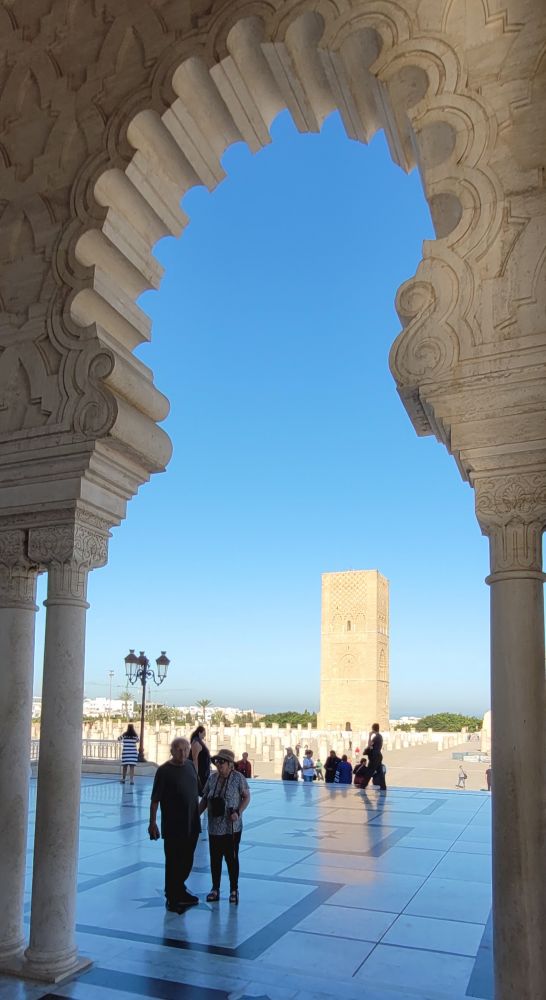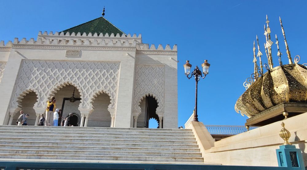 哈桑塔对面,就是拉巴特的另一个地标穆哈默德五世纪念堂,里面是他及两个儿子哈桑二世苏丹及阿卜杜拉王子的陵墓。穆罕默德五世是摩洛哥当今的阿拉维王朝的第25任苏丹,1927年即位。当时摩洛哥名为独立的王国,实则为欧洲列強的保护国,内部分为法国保护区,西班牙保护区及国际共管区。二战中穆哈默德站队英美同盟国,并得到美国总统罗斯福的许诺,战后支持其独立。