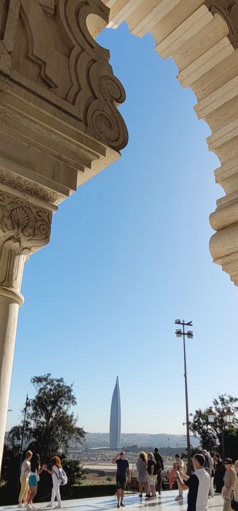 穆哈默德五世纪念堂是一座摩洛哥传统风格的正方形建筑,外墙立面是白色大理石棱形花纹,顶上是伊斯兰传统的绿色琉璃瓦,壮重而又优雅。纪念堂每一面都有入口,北边的入口面向古老的哈桑塔,可能意味着历史的传承。东边入口隔河远眺,则是拉巴特近年来的新地标,250米高的穆哈默德六世高塔。这座高塔是一座商业建筑,属于摩洛哥的一个金融集团,承建商是中国铁建。