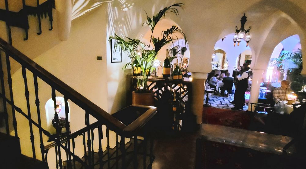 餐馆卡着点,下午六点半不早不晚准时开门。里面有上下两层,像其它摩洛哥宅院一样,二层中央也是一个中空的天井。我们因为只有两人,安排在天井旁边的座位。两个华人团,也在二层两头的餐厅里面。总餐过程中总的说来还算好,只有国內团有位坐在中间貌似大姐大的人物在大呼小叫,也不知啥来头,好在其他人声量都小。同一个团有这样的人物,其他人也很无奈。