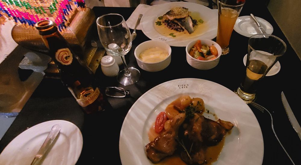 晚上我们预订了里克咖啡吧的晚餐,时间下午六点半,是晚上开门后的第一轮客人。等待时还要排队,一队是有预订,另一队是临时起意的。等待过程中先后来了两个旅游大巴,都说中文。后来得知一个团来自国内,一个是加拿大团。