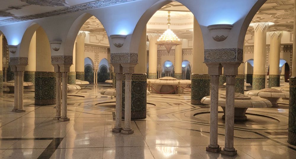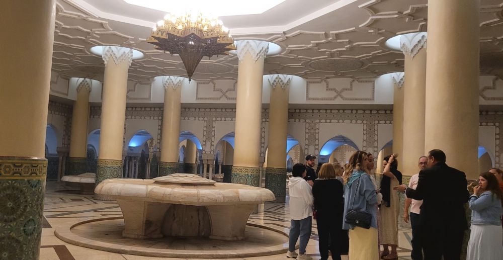 出了祈祷大厅后,我们又去了位于地下一层的洗涤大厅。大厅里面有上百座莲花状白色大理石洗涤台,可供上千人祈祷前同时净身。