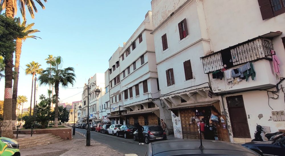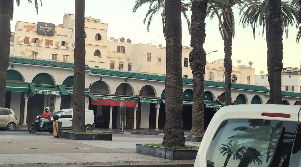 沿着滨海大道走了一段,一路绿化不错,但车多太嘈杂,我们决抄近路走老城。我们走的是老城外围相对大一点的街,时间又是早上,很多店铺都没开门,所以人不是太多。老城里面的房墙都是白色的,这就是卡萨布兰卡”白城”名子的来历。我们步行了大约十来分钟,远远看到老城一片高高低低的房顶之上耸立着一座白底绿色花纹的宣礼方塔,知道不远就是要去的那座清真寺了。
