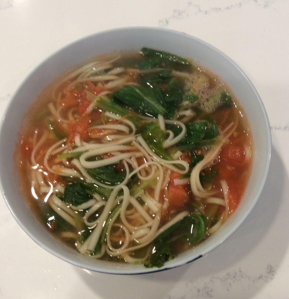 我最偏爱的小白菜吃法就是用它来做热汤面,热汤面讲求碗大汤宽,搭配西红柿鸡蛋,红的,绿的,黄的鲜亮亮的一碗家常便饭。(本照片那碗面没鸡蛋,吃完还没去买。)面相上稍打折扣。