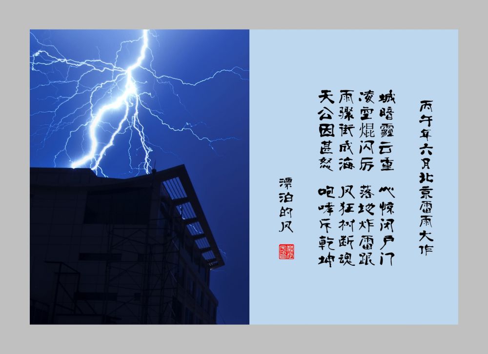 文中这张照片是2006年6月29日傍晚(19点左右)拍的,地点是北京紫竹桥附近的家中。适值天昏地暗,电闪雷鸣,雨骤风狂。特别要提到的是,那雷电之震撼实俺平生不多见,尤其是为了拍照,得开窗子,那近在咫尺的闪电和惊天地泣鬼神的炸雷,让俺后怕了好久。