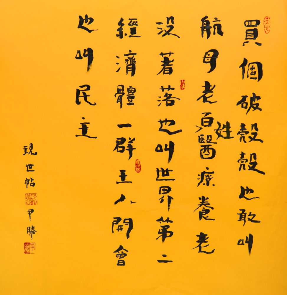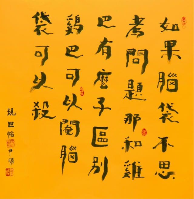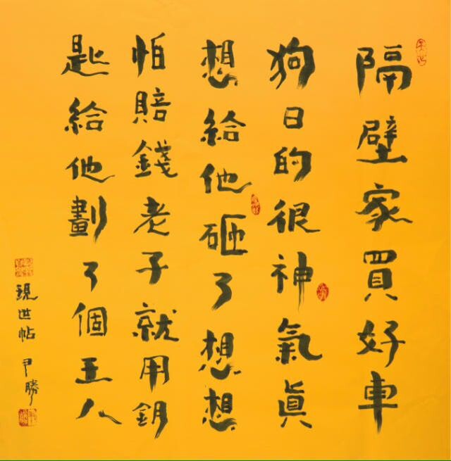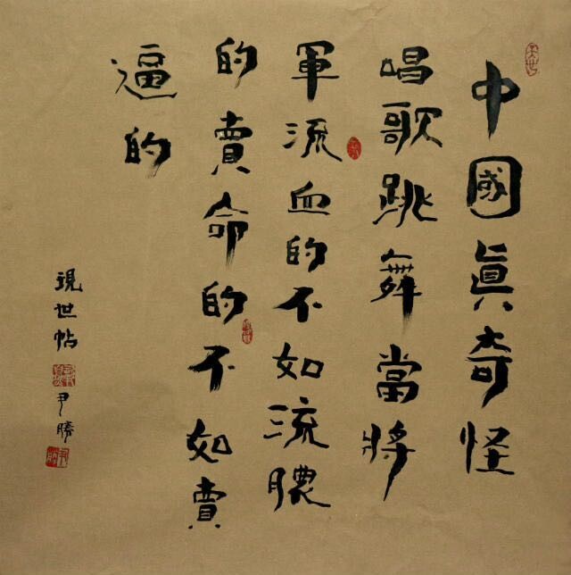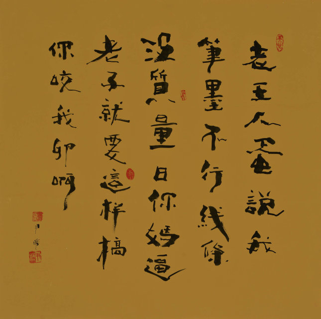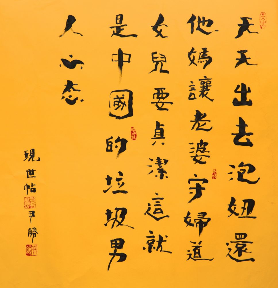 脏话与粗话在世界各语种文学作品中都是存在的,甚至可以入诗入音乐,同时也是我们日常宣泄情绪表达形式之一,既然可以入文学。入小说、散文、诗歌、音乐、绘画,为什么就不能入书艺?语言内容永远比表达方式重要,因为内容是表达的核心,而方式则可以是自由的。有人说我骂人,我的确没有骂人,至少没有明确姓名骂谁。我骂中国或者文化、政府,这不是一个人,这仅是一个概念,难道连概念也不能骂?我作品中的确涉及粗话和脏话,可是粗话和脏话事实证明不仅是可以入艺术的,也是在生活中常听常用的。我的《现世帖》,遭到许多人的谩骂和媒体的封杀,我希望有不同意见的人自问,我说的是事实吗?诗歌、小说、散文、音乐、绘画、电电视可以有粗话脏话,书法为什么就不可以?那么谩骂我的多是传统文化的卫道者,钟情于于老掉牙的竹菊梅兰自以为君子雅士,而实在因为他们太狭隘,太空泛,太玄虚。我们现在所说的中国传统文化恰恰是脱离于现实的伪道学。