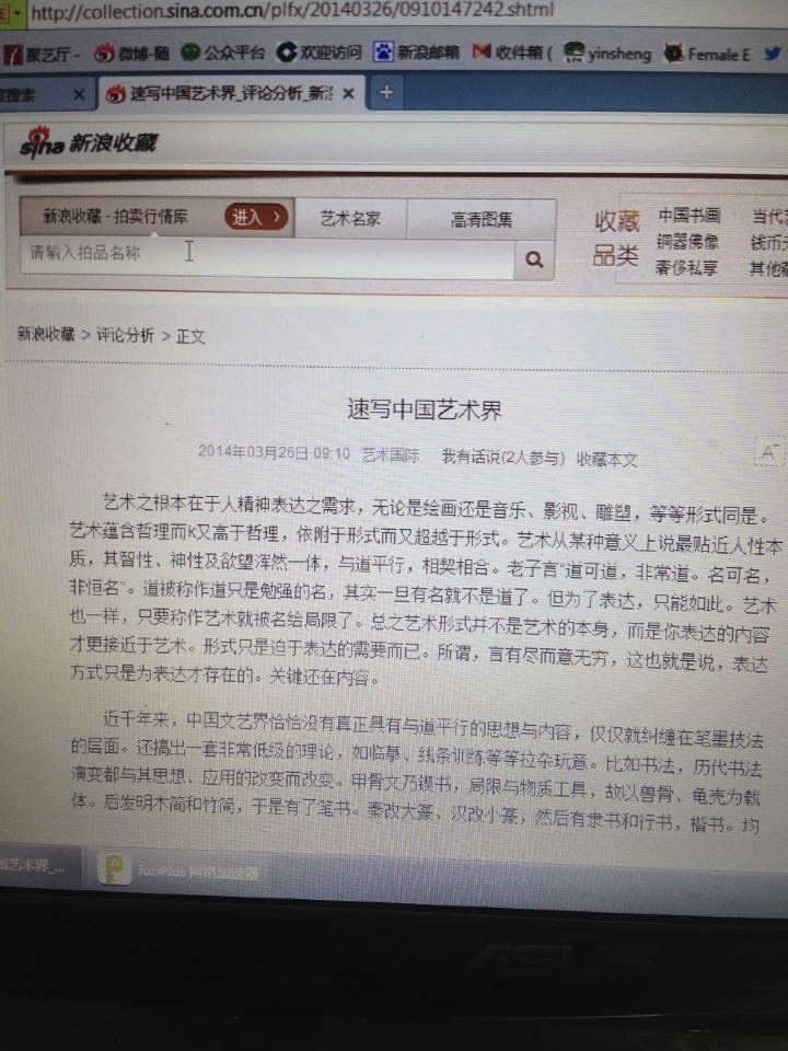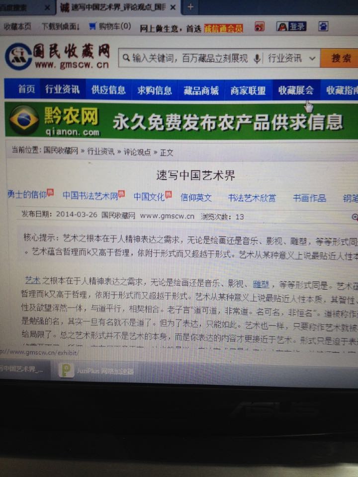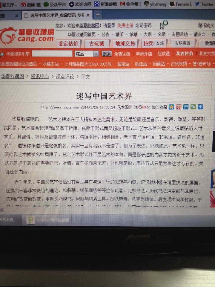 开始,我的确是想有所行动的,觉得应该为自己维权,可是当真的面对行动的时候,我却顾虑重重。发现自己并没有维权的能力,缺乏维权的本钱。我查了查,不仅仅有新浪收藏、华夏收藏、国民收藏、中国美术网,还有西祠胡同这样的论坛,并且还有各种微信公众订阅号,转载的文章有《速写中国艺术界》、《汉语文化及天道信仰之于中国社会未来》、《宗法专制下的传统绘画》诸文。这么些网站按说都是网络时代的主流媒体,至少应该比那些官方所谓的主流媒体更具道德操守才对。然而事实却并不如此。怎么弄?对簿公堂根本没有没时间和精力,找律师得花钱吧,还要取证,搞起诉书,上庭,判决。少则三五个月,多则一年半载,耗得起吗?想想都觉得害怕。现实中,我的时间本来就很仓促,读书、写字、画画、带孩子、陪家人、闲聊、打盹,这都忙不过来,要是说打官司,赢不赢都无所谓,我宁愿认输。再说你只是一个小小的个体,你没有后台,没有官衔,去面对国内这些官办或大型的网站,人家不理睬你,难道我为此去人家门前撒泼打滚?身体不好,脸皮太薄,实在也做不出来。还有,你这样一弄,人家以后干脆不转发你的文章,干脆把你封杀了,你的文笔再好,又有什么意义?!思来想去,我也有我的精神胜利法,我想,如果说文章有意义,对社会和别人有价值,作者的名字真的有那么重要吗?我们的民族很多时候太注重名了,名气大了,拉堆狗屎都是香的,往往名气掩盖了作品和真实的内容。这样想想,心里也就平衡些。