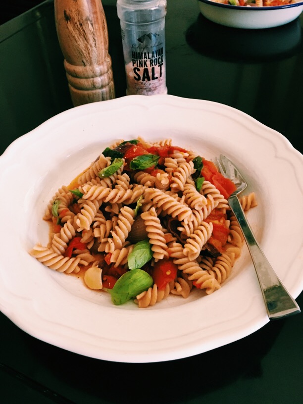 新鲜樱桃番茄,洋葱切开放入烤盘,烤箱烤1个小时后,和煮好全麦意粉拌匀,加自种罗勒叶,加盐,胡椒调味,浓浓番茄香,清爽美味。[