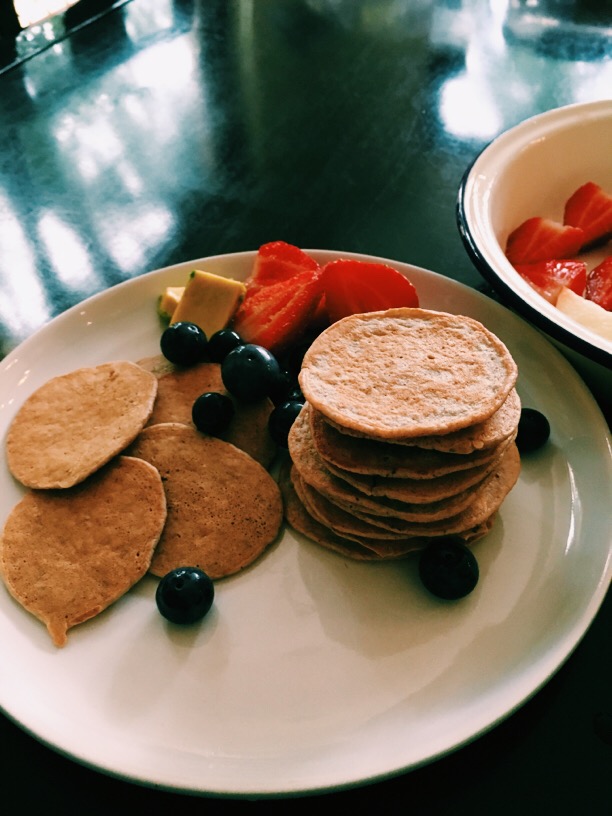 今天给儿子做了他最喜欢吃的pancake早餐,如果放任吃他可以吃掉整个一盘!我选用全麦面粉,almondmeal,chiaseed,flaxseed混合比例基本上是2:1:1:1,少许泡打粉,再加入一大匙蜂蜜,一个蛋,一大杯almondmilk。煎锅放少许油,倒入面浆。[