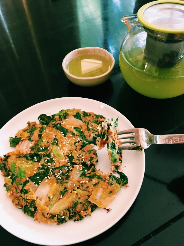 卷叶甘蓝因为它的营养价值越来越多人想着各种办法把它变成餐中美食,我今天中午做了这个卷叶甘蓝泡菜煎饼,配上日本绿茶,味道真的不错!干料:卷叶甘蓝切丝,香菜,葱切丝,加少量盐腌10分钟湿料:半杯全麦面粉,一只鸡蛋,水,混合成稀糊状干湿料混合加韩国泡菜两大勺平底锅加热倒少许油,倒入混合料,两面煎,有小小金黄就可。[