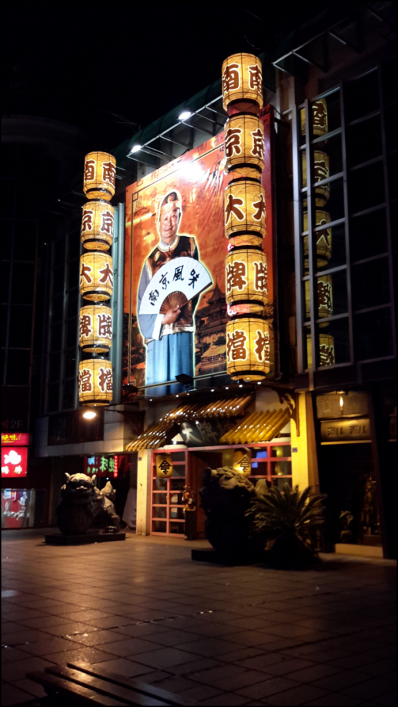 晚餐去了位于狮子桥步行街的南京大排档(狮子桥店),距离酒店很近。地址: 鼓楼区,湖南路狮子桥2号。价格亲民,饭店装潢很有民族特色,顾客进门就有店员招呼领位,餐后齐刷刷在门口拱手告别,很像那么回事儿,看来如今餐饮业的创新求异才是生存之道。因为都不是很饿,只点了些小吃: 鸭血粉丝砂锅,烤鸭包,鸡汤馄饨(受到老爸盛赞),酒酿圓子(很棒)等,区区66元。饭后逛步行街,买些零食,糖炒栗子,冰糖葫芦都是质优价廉,非常好吃,南京人民在吃的方面,实在是太幸福了。