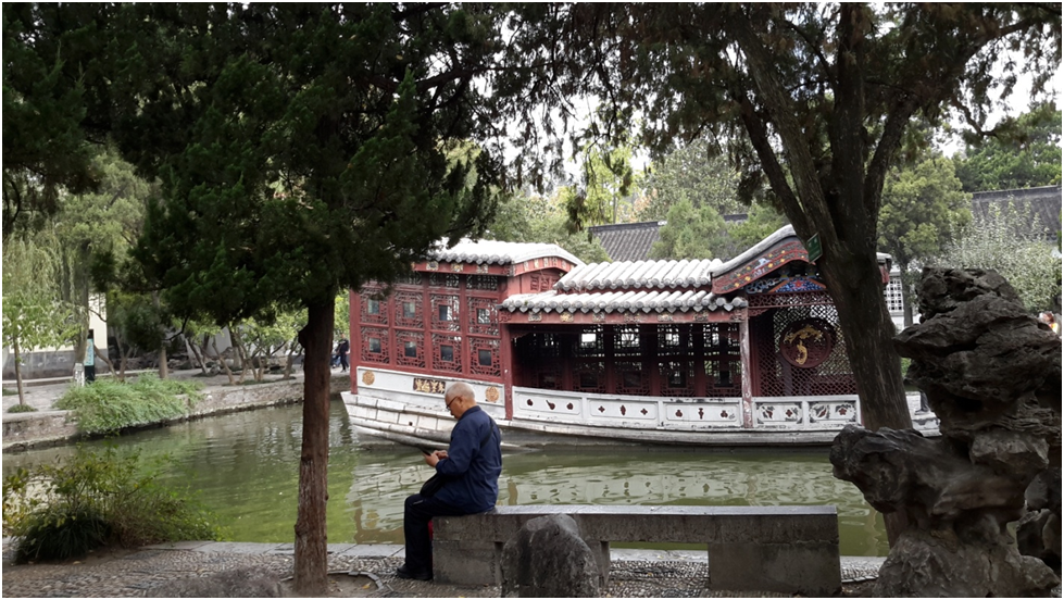 庭台楼榭,雕梁画柱,山水,石舫,回廊,飞檐,竹林,石子路。。。真的是一步一景,随便一个幽静的角落,都有让我惊喜的景致。景随步移,一点也不夸张。几年前苏州园林的游览,也没有给我如此深刻的印象,不知是不是那次过于仓促,没有静下心来欣赏。此时游人不是很多,许多地方可以驻足,静静欣赏,品评玩味。抽空儿给老爸偷拍了几张照片成功,很是得意。