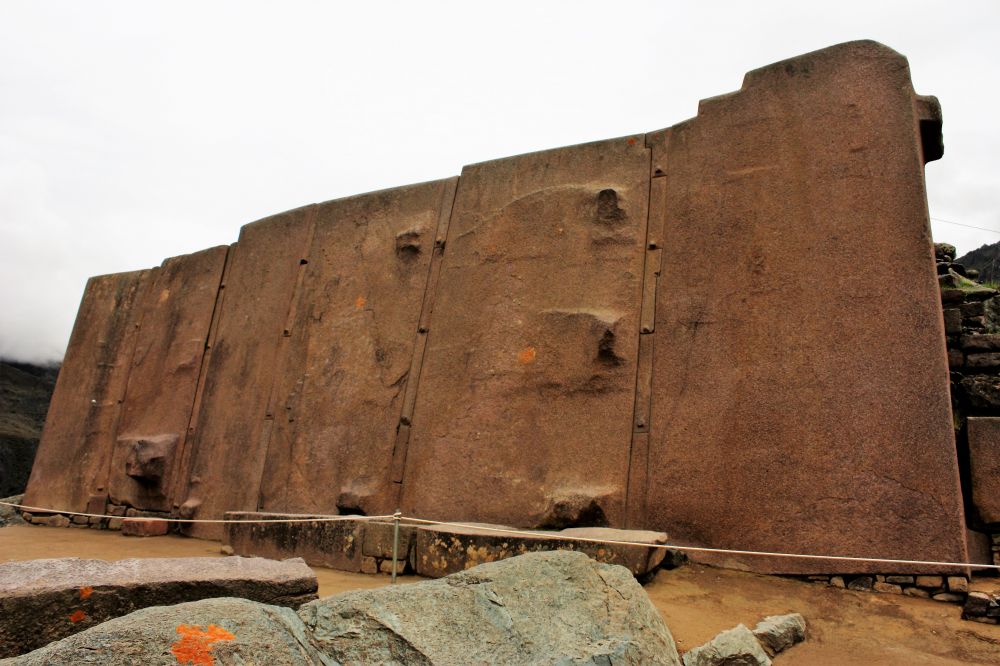 最精致的部分是太阳神庙。其中的六块大大的粉红色花岗岩巨石(rose granite),每一块石头的重量据说都超过五十吨,取材于附近山岭采石场。花岗岩巨石之间有窄窄狭长的石头,是用来抗震的。如果有震荡,小石条会上下震动调整,从而避免巨石的倾斜。印加人没有炼铁合金的技术,但是他们懂得使用铜器,巨石上留下的黄色斑点便是铜质工具打磨石头的证明。巨石的表面异常细腻平整,沐浴在晴光之中。周边山峰和古老村落随性朴拙,一边是雅致规矩,一边是粗放不羁,对比起来的感受相当奇妙。亦真亦幻,让人不知今夕何夕,唯有感慨惆怅。这里的神奇和独特一点儿也不比马丘比丘逊色。