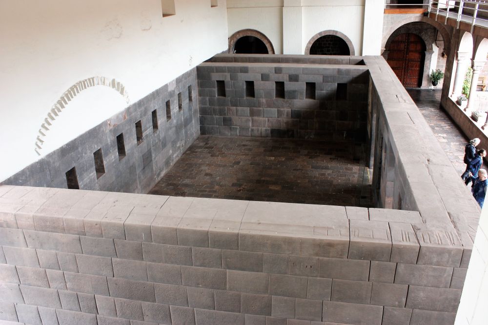 一早去参观太阳神殿Coricancha (Korikancha),也就是现在的圣多明哥San Domingo修道院和教堂。还没有进门,就遇到了一位毛遂自荐的导游,自称教授先生。谈好价格就开始参观了,有了导游看起来果然容易。教授自豪地讲述着神殿的历史,它曾是库斯科和整个印加帝国最受尊敬的寺庙,供奉太阳神印地(Inti)。印加帝王Pachacuti在重建库斯科城市布局的时候,是按照美洲狮puma的形象设计的,城外的要塞遗址Saksaywaman作为头部,市内的Coricancha神殿作为尾部。西班牙人统治时期,神殿被毁掉,并在其基石原址上建起了教堂。后来的大地震震垮了教堂,地基部分却巍然挺立至今。当然现在的San Domingo教堂也是重新修建的,依然用的是五百多年前的印加石基。