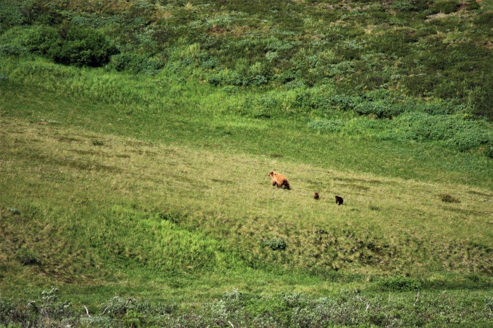 离两只棕熊不远的熊妈妈,领着两只小熊,翻过山坡,向远处遁去。据说熊宝宝在同类面前并不安全,大概熊妈妈嗅到了危险。