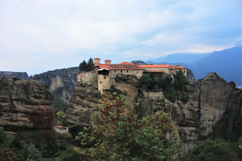 这个角度可以看到四个修道院:Roussanou (左前),St. Nicholas (左后),Varlaam (右上角)和Great Meteoron Monastery (最高处)。