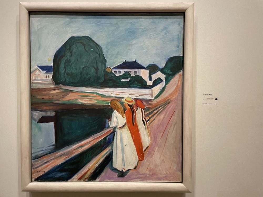 《The Girls on the Bridge》,蒙克画了很多不同版本。这一幅是1927的作品。如今,这幅画的绘画地点,奥斯陆南边的小镇Åsgårdstrand,时常出现在挪威旅游宣传手册中。