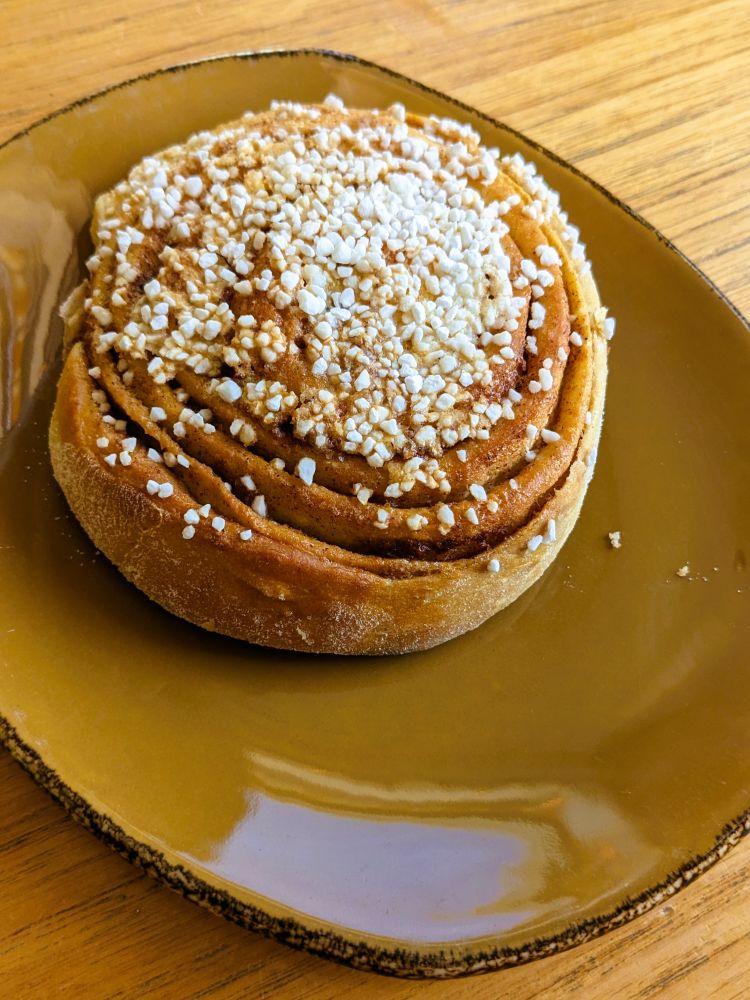 然后去咖啡店喝啤酒,从意大利来到北欧,物价的区别首先体现在了啤酒上,比意大利贵多了。女儿则发现了挪威的一种特色点心Norwegian Cinnamon Bun,里面因为含有cardamom而香味独特,她很喜欢,后来在不同地方的bakery买过几次。我吃着感觉糖和油都比北美的少,小豆蔻的味道比较浓郁。