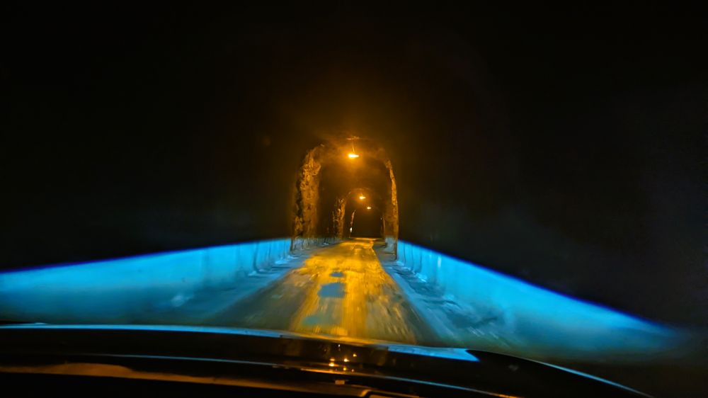 塞尼亚岛上第一次通过隧道。挺短但是很窄很旧,女儿专门拍照。后来发现在挪威公路系统中,隧道很常见,且远远多于桥梁。有些新修的隧道很长很宽敞,是收费的。出租的车辆上都有AutoPass,所以计费是自动进行的。行程结束后,租车公司会提供详细的收费道桥和隧道的费用。