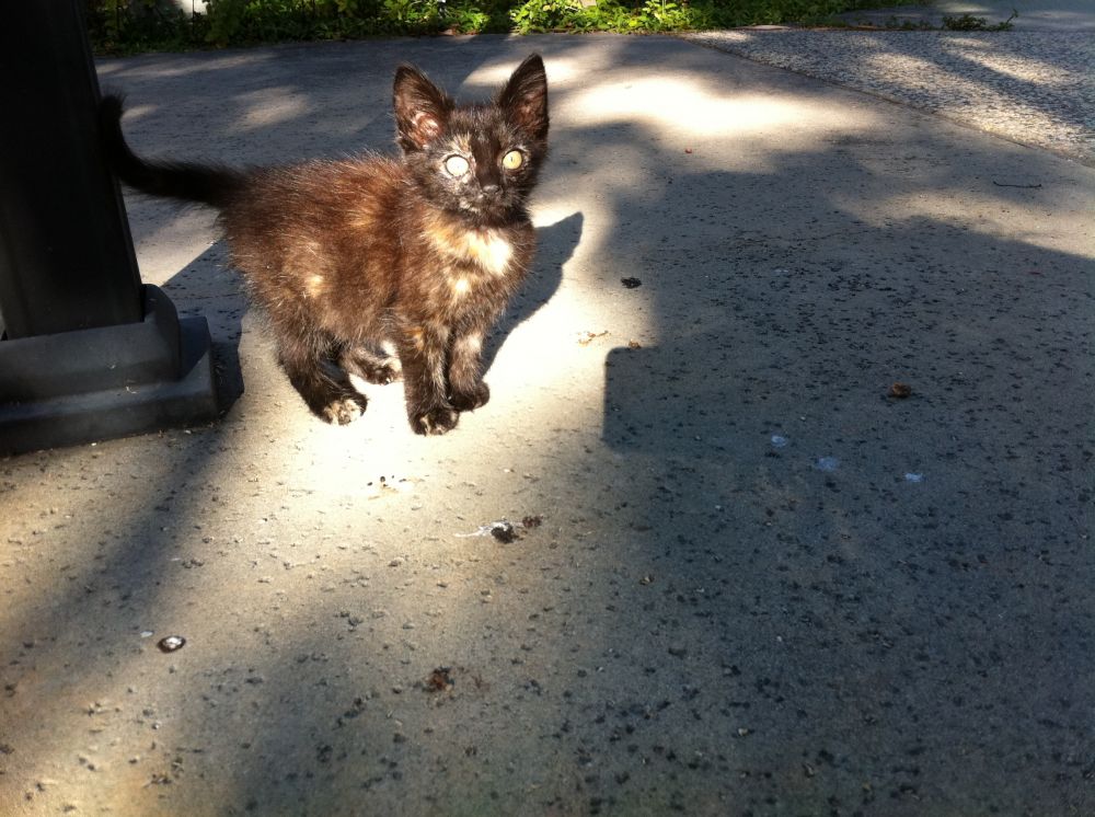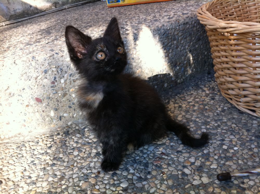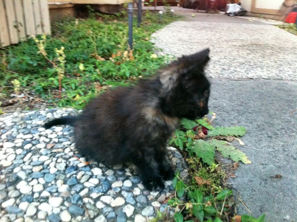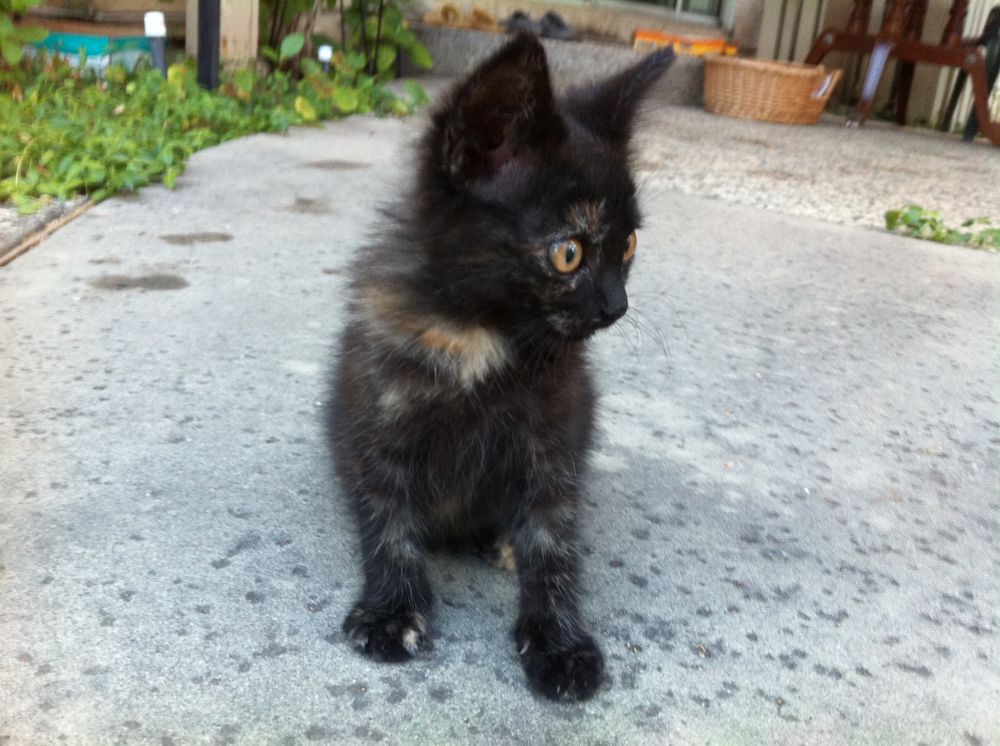 上网查询,小小黑符合毛色混杂偏黑的玳瑁,俗称抹布,意即看不出具体颜色的脏兮兮的抹布:-)虽说别名不雅观,却是名贵的品种呢。没曾想,不经意中,洗出了一个小玳瑁 其实,大多时候,晃眼一看,还是个小黑子。不过,我们不在乎,本来就是当小老黑带回家的,不管土猫名猫,来到我家就是好猫