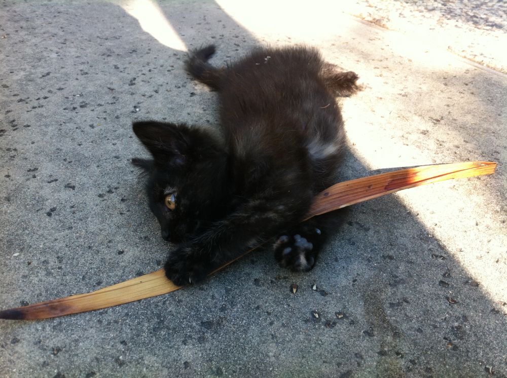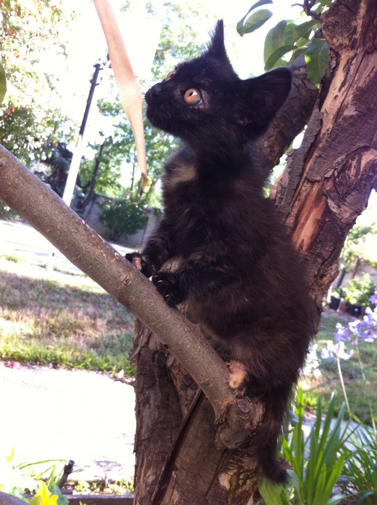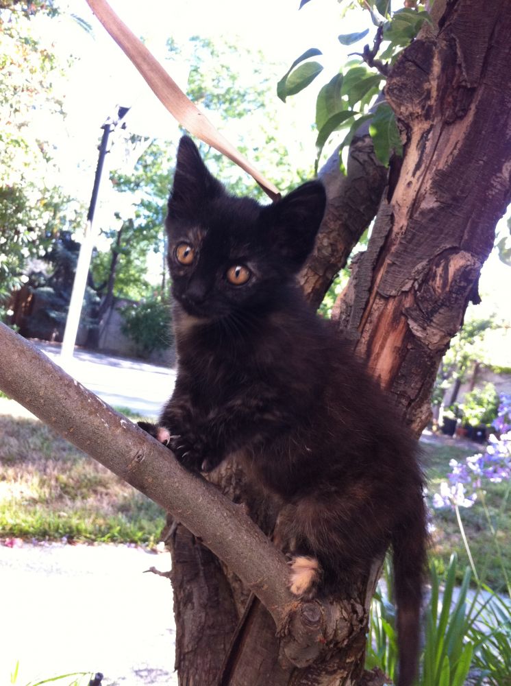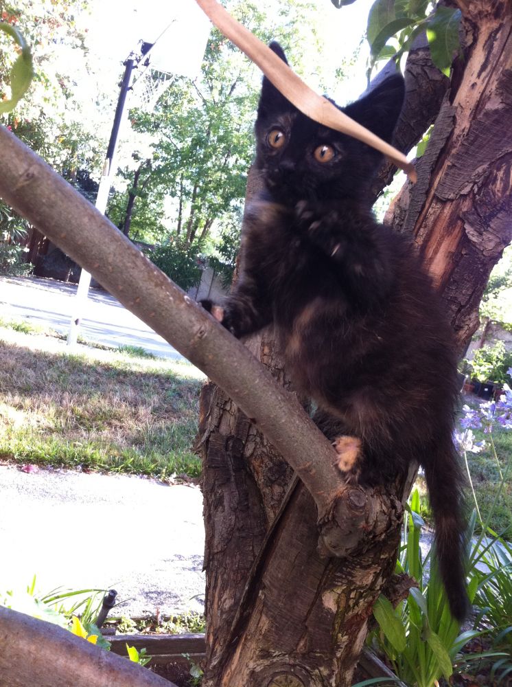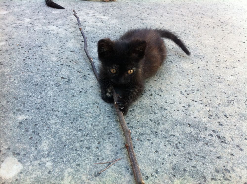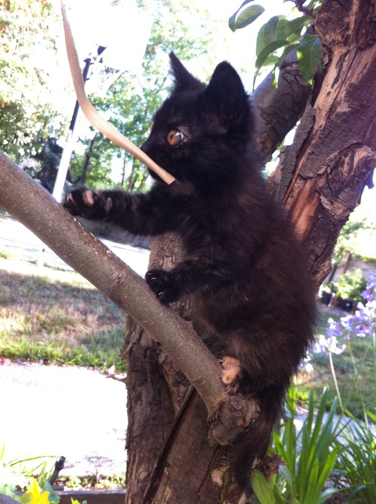 在家时间多,目睹了小小黑的各种顽皮,以及初生牛犊不怕虎的江湖风范。地上的树枝,她会当枪使;鸟儿筑巢遗落的黄叶,她能当绳拧;院子里的栽树,她可爬上跳下柔韧有余,活脱脱的一个小侠女啊