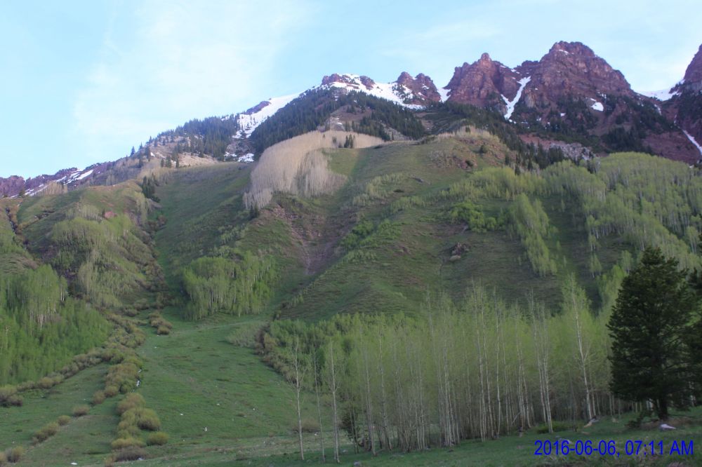Maroon Bells (中文有人译成阿斯蓬,或褐岭峰)是科罗拉多州最佳摄影地 (most photographed place in Colorado)。也是北美最美的摄影地之一 (one of North America's most photographed scenes)。离著名的滑雪胜地ASPEN 和SNOWMASS 有十几英里。它不是国家公园,也不是州立公园。它的主峰MAROON PEAK (4317米)仅比LONGS PEAK(4345米) 低28米.事实上,它位于科罗拉多最高峰MOUNT ELBERT (4401米)所在的SAWATCH RANGE 一带。自己放$10在入口处的邮筒。我们到达时已是下午5点多了。这个景点其实就是一个U形的山谷,主峰MAROON BELL 不远是小湖MAROON LAKE,左右两侧有高耸的山峰。