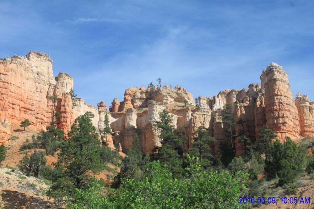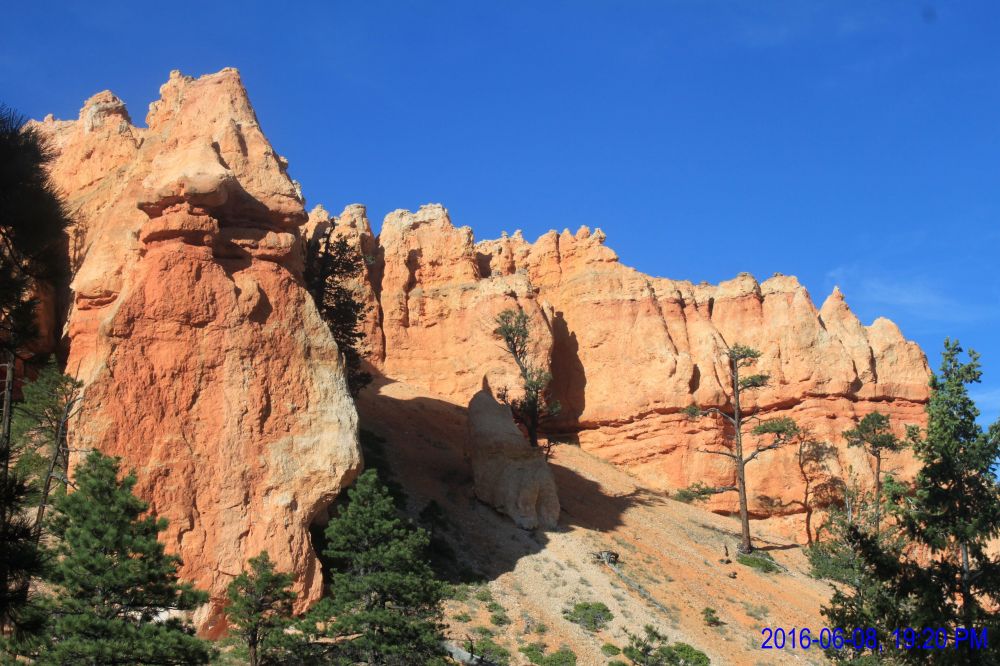 离开下羚羊谷,我们一路沿89号公路北上。右拐进入12号公路,经过了红峡谷 (RED CANYON), 它是DIXIE 国家森林公园的一部分。各种高大的红色的柱子,山丘时隐时现。