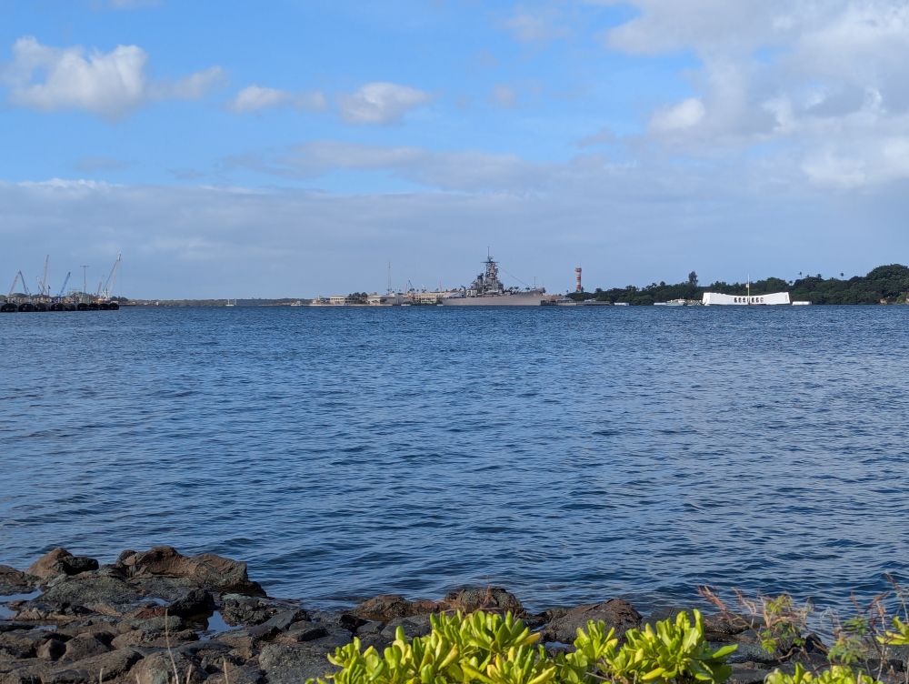据导游介绍该艇当初在对日作战中,成功击沉击伤了日方舰艇多达四十多艘,是一艘著名的英雄舰艇,战后退役就被置放到珍珠港展示,对美国人进行爱国主义教育。远处海面上有一座白色长方形物体,是为纪念死于珍珠港事件的美国士兵的纪念馆,在那座海上纪念馆的下方,海底里沉睡着当初被日方击沉的一艘战列舰,那列战舰上死亡的士兵有一千多人,是损失最为惨重的。珍珠港海水清澈,从空中俯视,那个白色纪念馆与海底的战列舰恰好形成一个十字。导游说美国人平时看着嘻嘻哈哈满不在乎,但其实都十分具有爱国情怀,尤其是二战时,几乎每个家庭都有人在军队中服役,对于在战争中失去亲人的疼痛感同身受,所以美国人来珍珠港几乎都会坐船渡海去那个海上白色纪念馆参观吊唁,据说在馆内参观的美国人总是庄严肃穆,有的甚至会潸然落泪。在白色纪念馆的一旁不远处,停泊着密苏里号战列舰,那是当年麦克阿瑟将军接受日本投降仪式的战舰,如今已退役,停靠在珍珠港内供人缅怀历史。