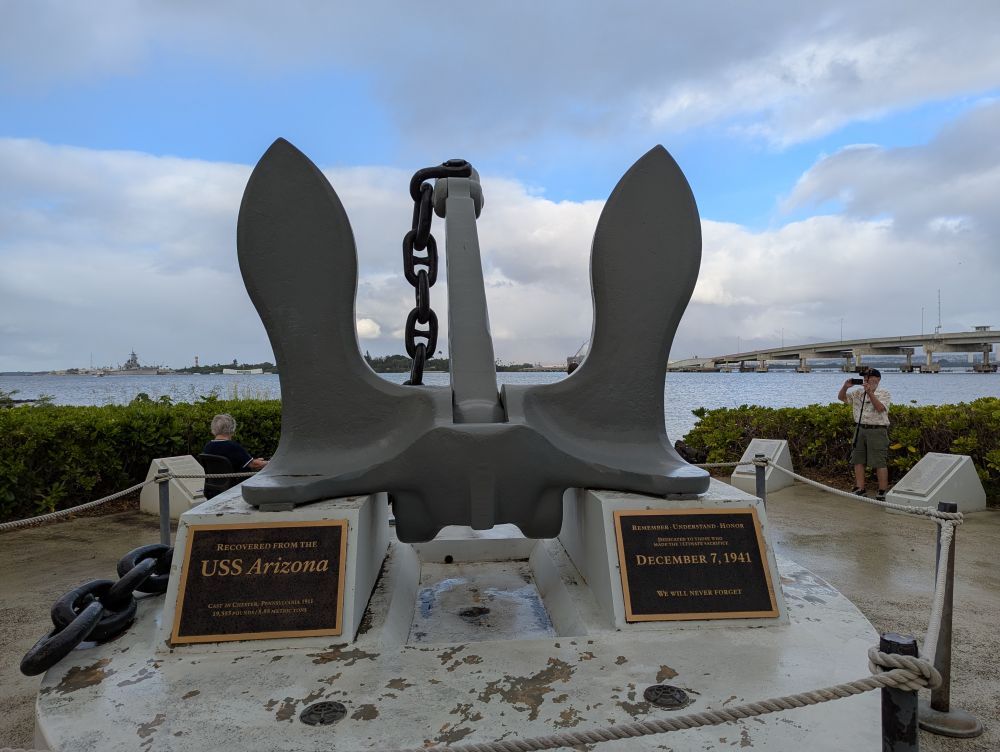 正对着入口处的海边置放着一只大锚,重量达一万多斤,据说这是珍珠港事件后从距离被炸毁舰艇本体九十米远处的海底打捞上来的,可见当时日本轰炸的威力之巨大。