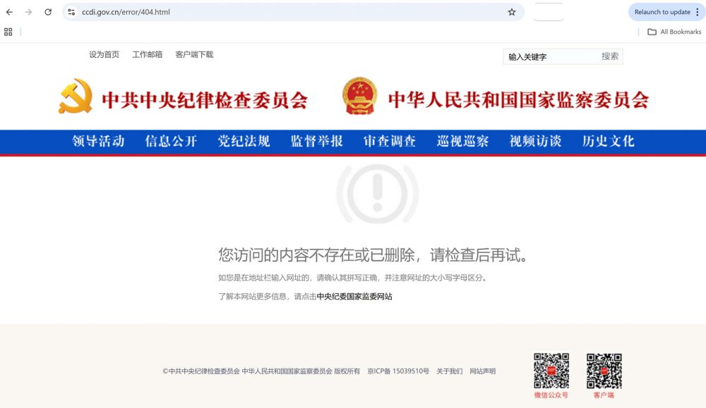 但奇怪的是,中纪委和国家监察委网站上,显示它们网站上,张又侠张振立被立案调查的通报被404了。见下图: