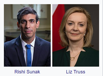 英国保守党在7月13日到20日间经过保守党国会议员的5轮投票,在8位候选人中选出最后的两名,分别是苏纳克(Rishi Sunak)和丽兹(Liz Truss),二人得票数为137和113(共计355张票)。这两人将由保守党党员投票决定最终的胜者。