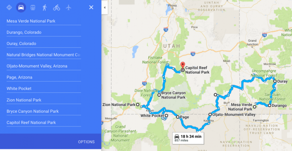 Million Dollar highway, Mesa Verde National Park, Nature Bridge National Monument, Goose neck State Park, Mexica Hat Monument, Valley Of Gods National Park, Monument Valley, Horse Shoe Bend, Powell Lake, White Pockey, Zion National Park, Bryce Canyon National Park, Capitol Reef National Park.