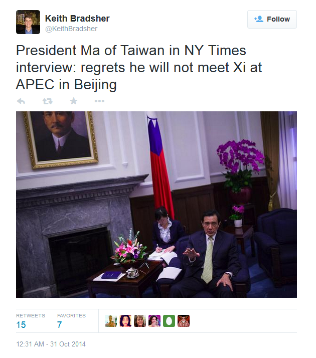 纽约时报刚刚刊登了对马英九的采访。马说他既支持香港占中,也要争取大陆贸易,对习近平不邀请他参加北京的亚太峰会,表示“遗憾”。