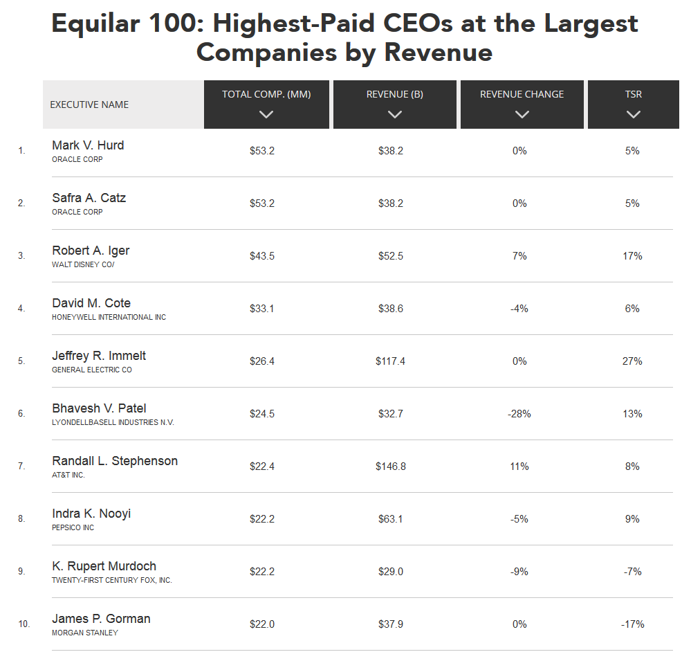 前十名而已.参见:Equilar: CEO Pay Hits $14.5 million at the 100 Largest Companies by Revenue。也许最可怜的是苹果老总库克(Tim Cook),Tim Cook Is Not Apple's Highest-Paid Executive