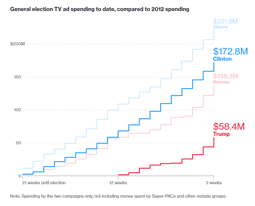 《彭博》“For the first time this cycle, Donald Trump is outspending Hillary Clinton on television advertising: he’s spending $14.4 million to her $13.9 million during the week beginning Oct. 18. (On average, Clinton has spent $9.1 million per week since the last primary election on June 14, compared to Donald Trump’s $3 million per week.) Still, the decrease in overall ad spending this cycle when compared to the last presidential election is stunning: Factoring in advertising by all outside groups, there’s been roughly $450 million spent on general election TV advertising; four years ago, the total amount spent was more than twice that”,然而,《华盛顿邮报》Donald Trump’s campaign has spent more on hats than on polling;《赫芬顿邮报》Trump’s Donors Paid For His Jetliner, His Hotels And Now, His Books钱先流回淳企(Trump Corporation)。淳朴依旧说“我钱多,要往下砸”,但是没人见到多一个铜板。