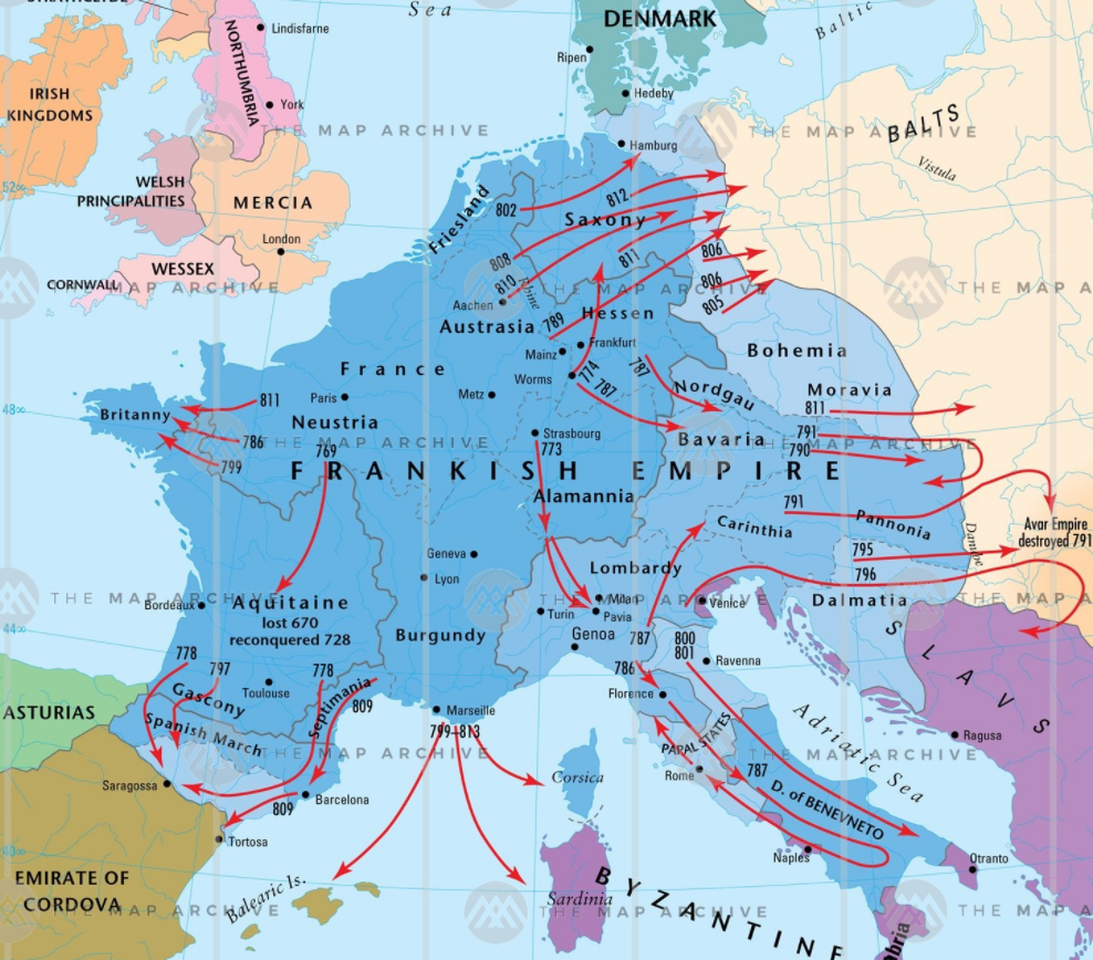 自君士坦丁大帝313年皈依基督教【注:实际的过程远为复杂,既不是一天就皈依,基督教也不是几年就在整个帝国被接受】,到476年西罗马被推翻【注:阿提拉(Attila the Hun)匈人对西罗马有致命的打击。在中国,有许多匈人乃被汉朝赶走的匈奴后裔的浪漫传说】,欧洲已经沦落为四分五裂的小领主区域,西罗马地域的基督徒和北方的游牧民(德国)族斗了几百年【从地缘政治和地理来看,这是欧亚大陆共同的现象】,不分胜负,但到了查理大帝之父统领的法国王朝(Carolingian Dynasty)之际,查理家族已经有很大的势力,其农耕区域实力已经大胜游牧部落。查理大帝是个军事天才,继任后征服北方的德国游牧部落,基本统一欧洲。