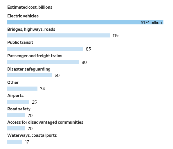浏览了一下拜登大政府【1】的最新动作,2.3万亿重建美国基建的宏图大略,中文外宣【2,3】一般持怀疑态度,集资的困难,债务的负担,力度的不足,这种怀疑美国自然也有,如一向反大政府的《华尔街日报》社论小组【4】,有些时候美国官宣也挺肉麻的,连中文都用“九大领域雨露均沾”一类的字眼,拜登更火了,“全民雨露均沾”【6】,不过你要是后宫的妃子,就知道“雨露”多稀罕,用不着遍读官媒的宣传,看看《华儿街日报》这张图【7】: