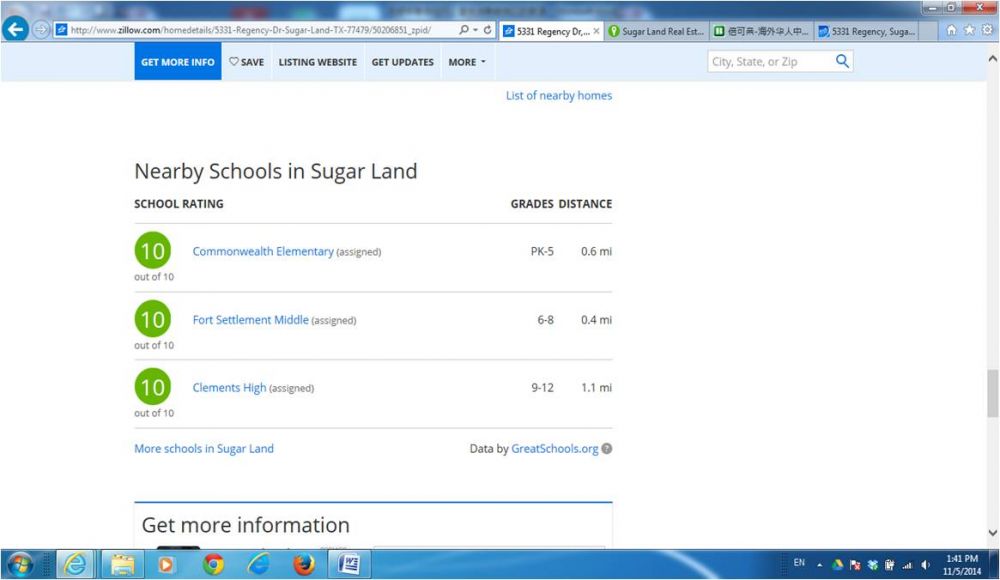 在Zillow上展示的房源除了照片和基本介绍以外,还增加了一些有用的信息,如zestimate detail,price history,Tax history,Mortgages,Nearby schools等。其中最有用的是Nearby schools的内容,不仅提供assigned school的名称,而且还有学校的分数。而HAR网站中的房源一般只提供学校名称,没有分数;有的甚至只填某某ISD,或者干脆空白。所以,在HAR网站上找到的房源可以在Zillow上核实学校的名称和分数。
