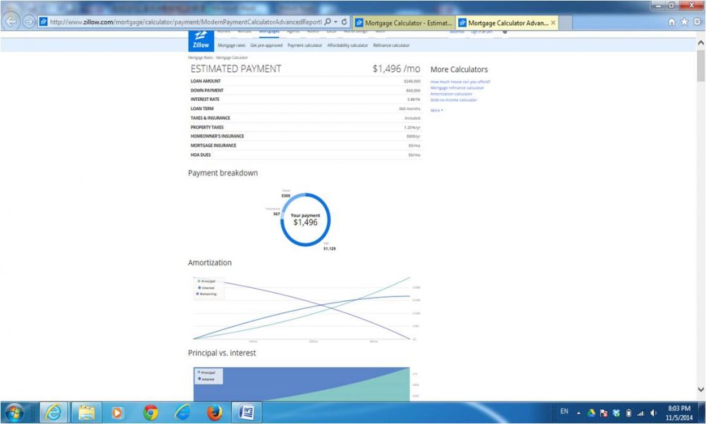 Zillow网站上还有一个不错的工具就是"Morgages"栏里的“Mortgage Calculator",在它的“Full Report"中可以看到ESTIMATED PAYMENT, Payment breakdown, Amortization和 Principal vs. Interest等,非常清楚,一目了然。