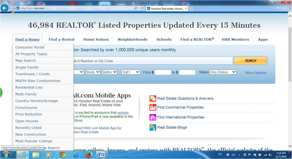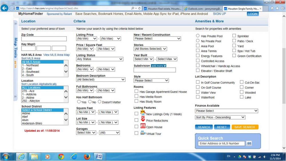 1. MLS 官方网站。就象我前面文章中提到的MLS是美国房源展示系统,一个地区拥有唯一的一个MLS。大休斯顿地区的MLS是由休斯顿房地产经纪人协会(Houston Associates of Realtor, HAR) 负责管理,其官方网站为www.HAR.com, 休斯顿地区所有房地产经纪人的房源都会在这个网站上统一展示。这些房源由经纪人输入,其照片的大小、规格以及数量、房子信息的填写、以及房子状况描述按有关规定完成;Active, Option Pending, Pending, Sold等不同交易状态由经纪人实时更新。如果要搜索休斯顿地区的房源, HAR是休斯顿地区最权威、全面、准确、实时的房源展示网站,所有其他网站的MLS房源都是来自于这里。但由于HAR仅覆盖大休斯顿地区,许多外州或者在国内的购房者一般不太了解。