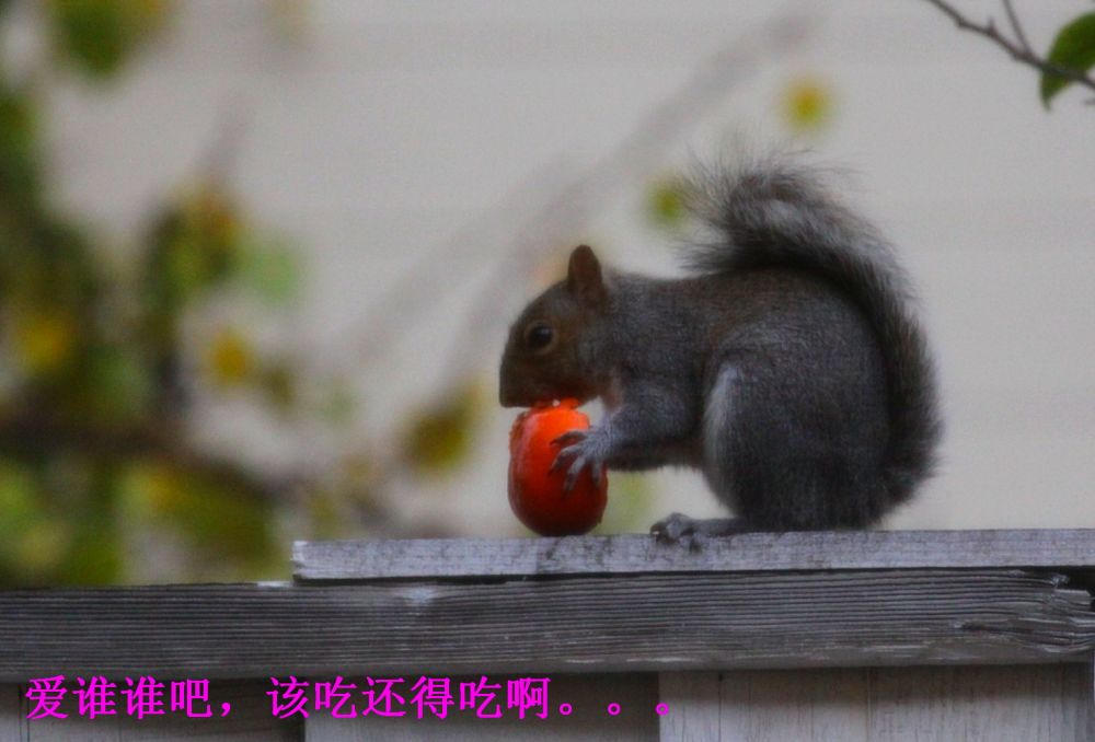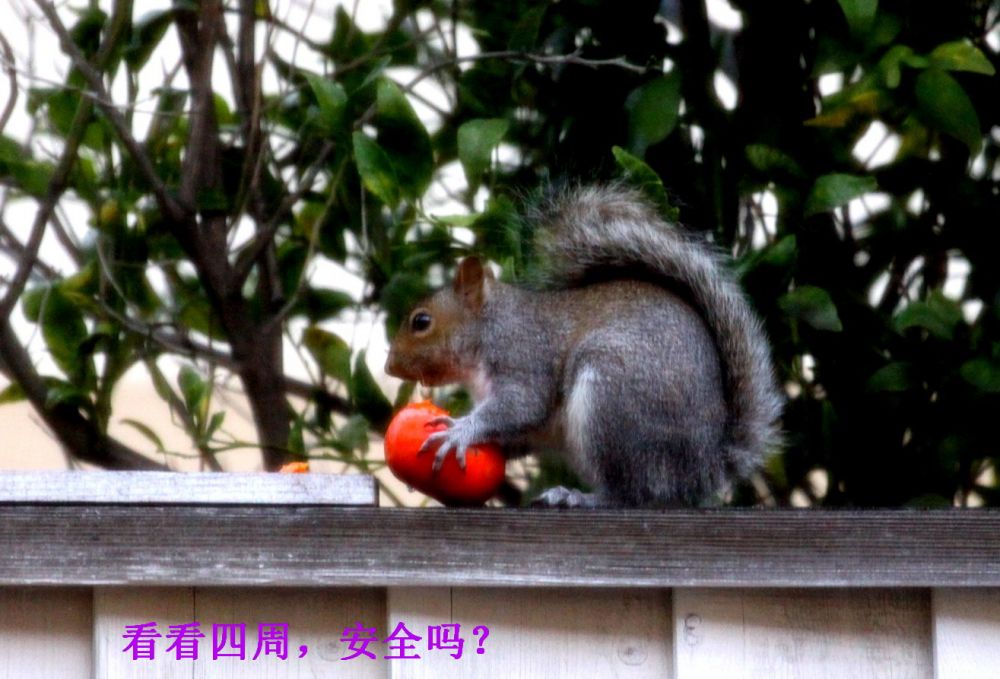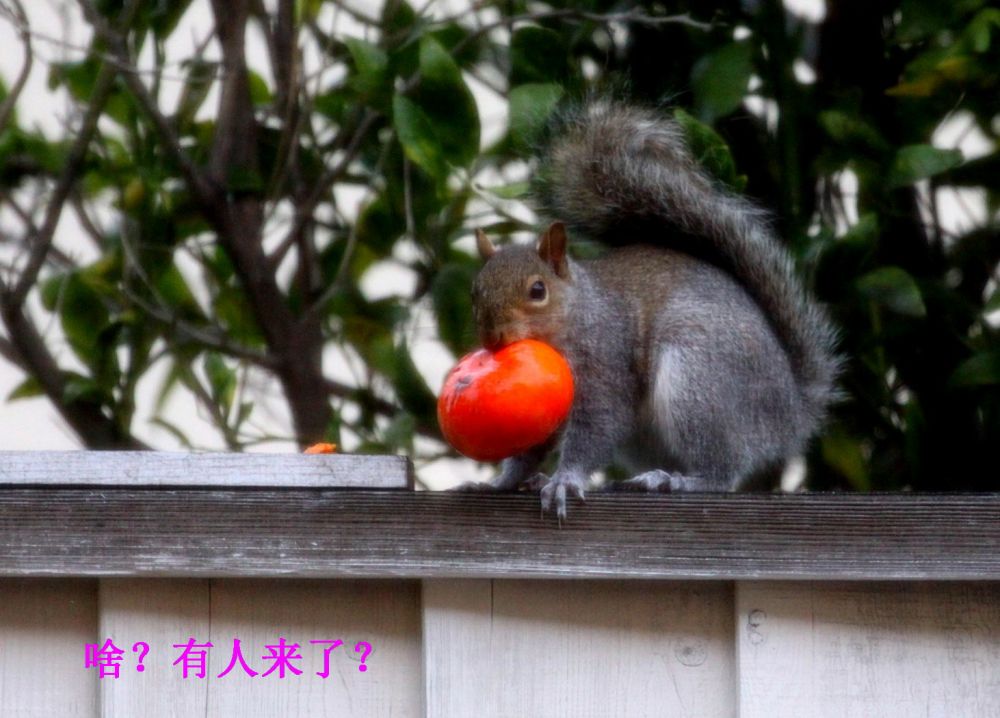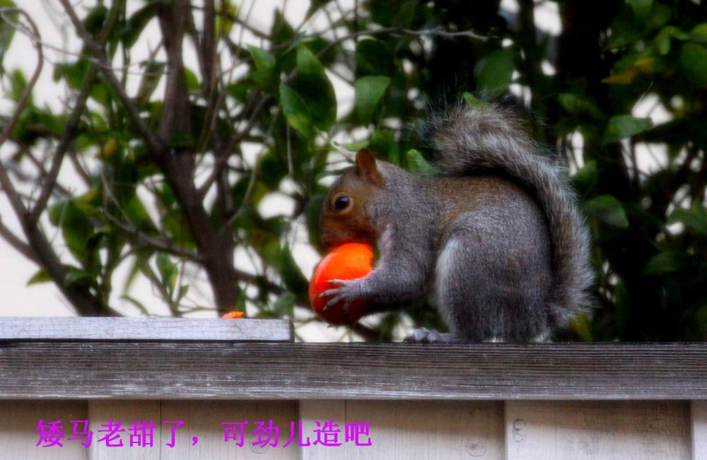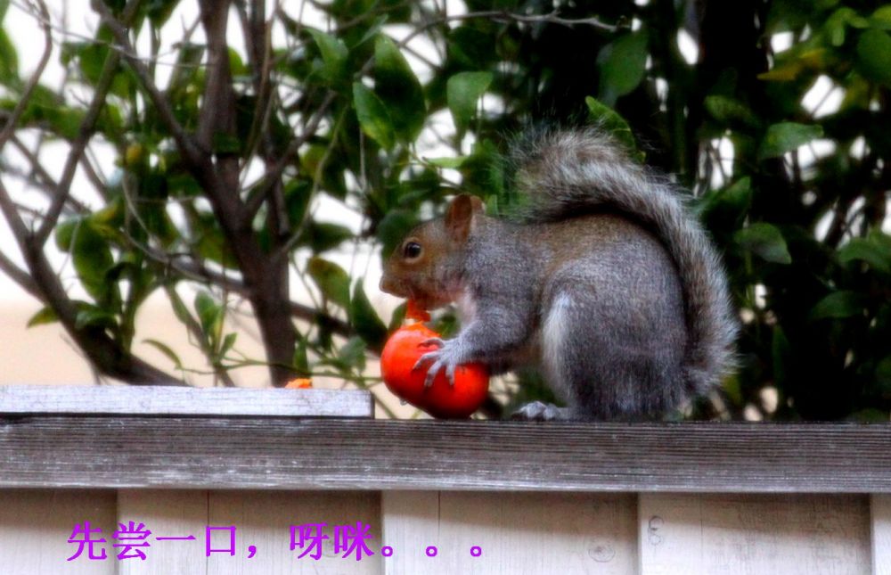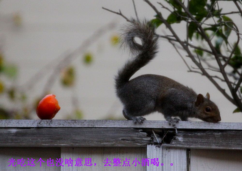 家里的柿子红了以后,松鼠就成了心病。这厮每天到树上造访,专门拣大个熟透的下口。浅尝辄止后 ,吞食些许果肉,留下几个牙痕就另寻目标去了。可怜那些受伤的柿子一天天烂掉 ,落在地上粘糊糊脏兮兮,让人心疼。几周过去这样糟蹋的果实不下半百 。