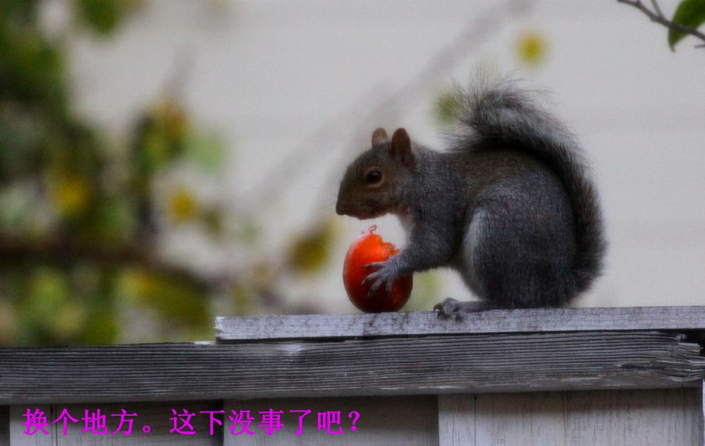 为了保护剩余的柿子,前几天通通摘下放进了纸箱。只见那松鼠每天依然上窜下跳地,就是找不到吃的了。为了让这个惯偷现形,今天拿出 一个小的放在木栅上,抓拍了偷吃的全部过程。不同的是,到了最后,这厮终于明白了浪费可耻,或是觉得来之不易。只见它先吃后运,把整个柿子消耗了。只是偷运过程在我不留意时发生,没有留下画面。有感是天下同理,物资匮乏时才懂得珍惜啊。