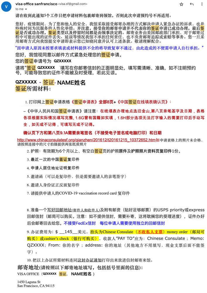 作为签证流程的第一步,前先向领事馆的公开咨询邮箱发了邮件,(10月24日起,驻旧金山总领馆领事保护与协助电子邮箱调整为SF_LB@csm.mfa.gov.cn, “健康码”咨询电子邮箱调整为SF_HR@csm.mfa.gov.cn)咨询办理签证的最新流程和要求。同时向一个朋友了解了最近办理签证的经验,这的确很有帮助。预计我从申请发出到拿到签证需要至少10天时间。