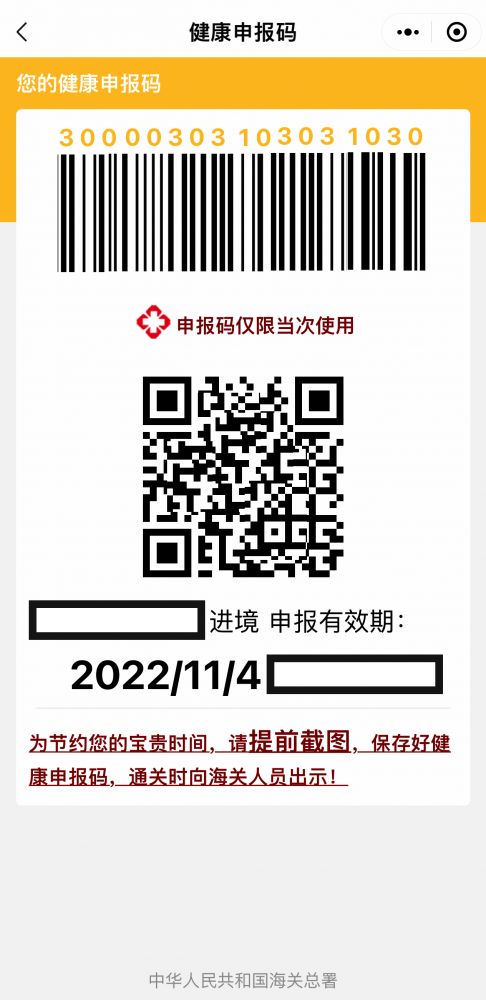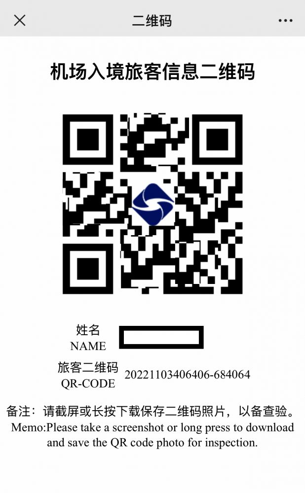 晚7PM到达机场,有建议提前三小时值机,因为手续复杂。值机柜台前几乎没有排队,工作人员首先提醒乘客先申请“海关指尖码”,用手机微信扫描二维码调出中国海关的微信小程序,填写相关信息(护照信息,前14天到过的国家,目的地,航班信息,座位号……)然后就得到一个带有黄色顶部边框的二维码,而且提示可以截图保存,预备随时查用(这与核酸绿码不一样)