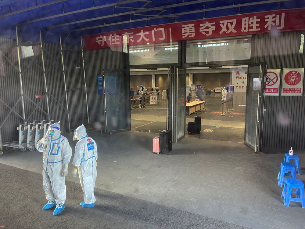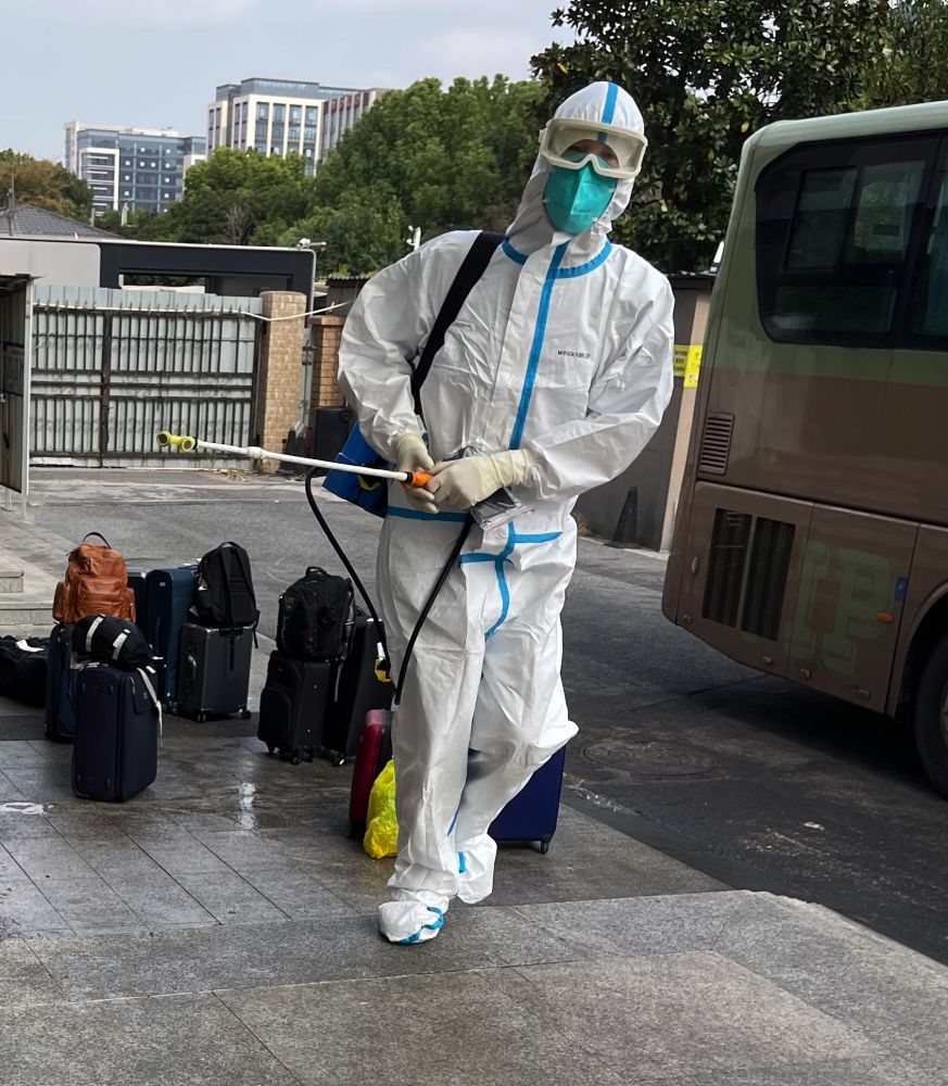 我们在大堂门口下车,大家提着行李想进入大堂,被门口一个大白拦住,他/她(看不出性别)不说话,只是用手指着大门边上的一块小空地。众人以为要在那里集中一下,可大白又做手势要大家过来大厅门口,于是众人又提着行李回来,结果又被大白拦住,大家一来一回觉得非常茫然,不知所措,有乘客不高兴“能不能说句话,要我们怎样啊?”,这时大白指着空地(男声)说了两个字“行李”。奥,明白了,是要我们把行李放在空地,人进入大堂。所有行李,包括大件行李,和背包,挎包,只要不能放进衣服口袋里的东西都要放在那里。后来才知道,是要集中喷洒消毒液消毒。我可怜的真皮包啊!