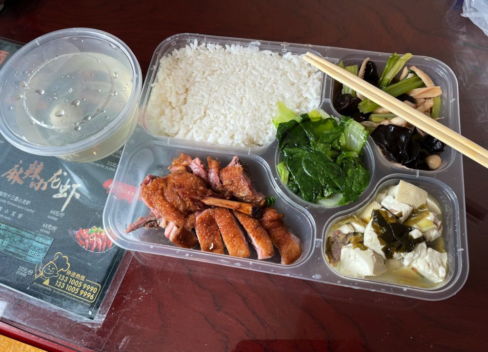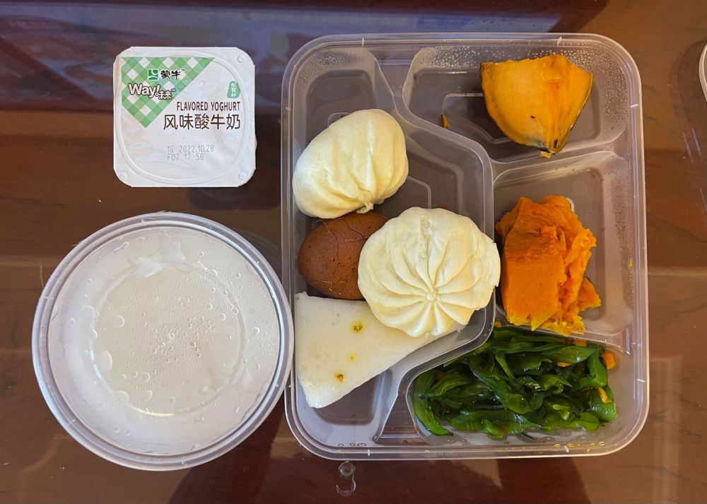 一日三餐都是酒店提供的标准餐,早晨是稀饭馒头鸡蛋牛奶,午餐晚餐是五菜一汤(其中一个纯荤菜,两个荤素菜,两个纯素菜),搭配和口味都非常好,只是量不太够,每次快到吃饭的时间就饿了。在隔离的房间里很难有什么运动,所以这样的饮食是有利于健康的。