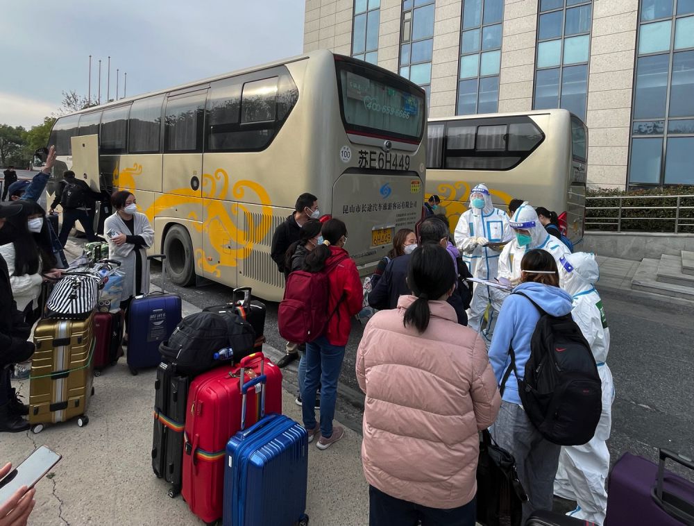 7:50AM两辆大巴到达,一辆是转运苏州人,另一辆是转运江苏其他地区的人。从大巴上下来的江苏接收工作人员按照事先拟定好的名单,叫每个人前来,核实每个人的“转运单”,然后发给一双乳胶手套,和一个N95口罩,要求每个人带上手套换上新口罩,然后再上车。所有人上车后就出发了。